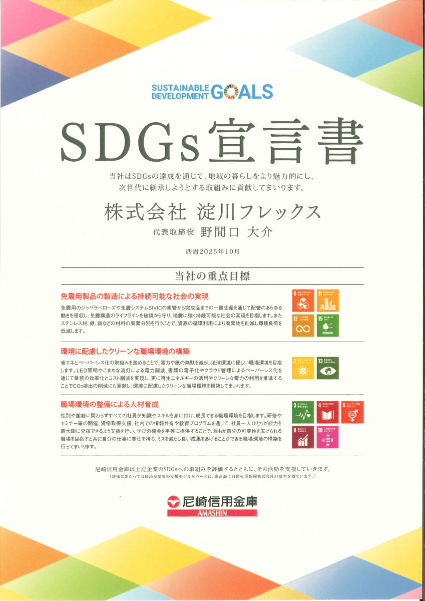 免震システムSIVIC製品のステンレスフレキ製品、ジャバラ製品の素材から製品製造から完成品までの一貫生産を通じて、地震の動きの相対変位を吸収し、免震構造のライフラインを地震から守り地震に強く持続可能な社会の実現を目指します。また、材料別の廃棄分別を行うことで、資源の再利用により廃棄物を削減し環境負荷を低減します。